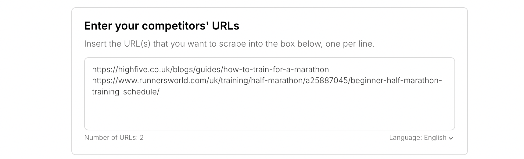 First, you’ll have to input one or more competitor URLs into the input box at the top of the screen.